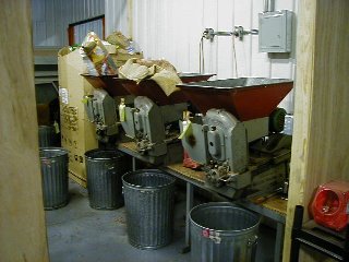 First step is the scale, which I thought would be highly uninteresting to take a picture of. We weigh your pecans and write you a ticket containing your name, the number of pounds, and the time the pecans will be ready. The time can vary from a few minutes if there are no batches waiting and your batch is small to up to four weeks on a crazy, pecan-filled year! At the end of this time period, just remember to bring back your ticket to claim your pecans! It makes our lives much easier. Pictured is one of the six pecan crackers we use to break the shells with, and it cracks the pecans one at a time and drops them into a 20-gallon bucket.