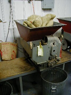 First step is the scale, which I thought would be highly uninteresting to take a picture of. We weigh your pecans and write you a ticket containing your name, the number of pounds, and the time the pecans will be ready. The time can vary from a few minutes if there are no batches waiting and your batch is small to up to four weeks on a crazy, pecan-filled year! At the end of this time period, just remember to bring back your ticket to claim your pecans! It makes our lives much easier. Pictured is one of the six pecan crackers we use to break the shells with, and it cracks the pecans one at a time and drops them into a 20-gallon bucket.